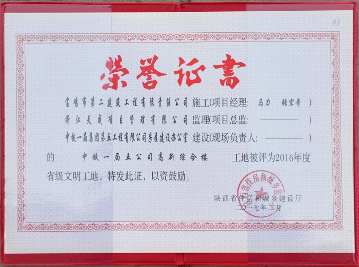 2017年度省級(jí)文明工地(鐵一局五公司綜合樓)