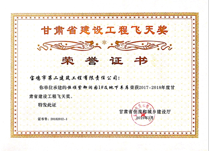 2017-2018年度甘肅省建設(shè)工程飛天獎(jiǎng)(恒順紫御潤(rùn)園1#及地下車庫)